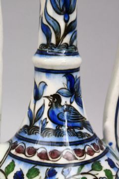 A 19TH CENTURY PERSIAN QAJAR GLAZED POTTERY EWER, with floral decoration, 28.5cm.