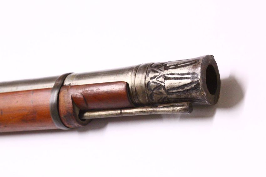 A VERY LONG 19TH CENTURY INDIAN MATCH LOCK / WALL RIFLE, with an certificate signed by maharaj of Jaipur, 226cm