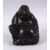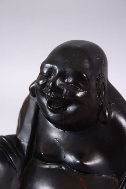 A CHINESE CARVED HARDWOOD / HONGMU FIGURE OF A SEATED BUDDHA, with a humorous expression and one hand upon his knee, possibly hongmu, 17cm.