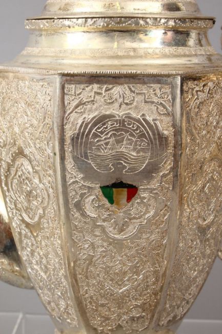 A LARGE SILVER PERSIAN TEA SET WITH KUWAITI EMBLEM, comprising six small cups, 6.5cm, tea pot, 22cm, coffee pot, 17cm, a sugar jar, 17cm and a cream jug 15cm high, six spoons, each item carved with formal scrolling foliage decoration with beast spouts and painted emblems,