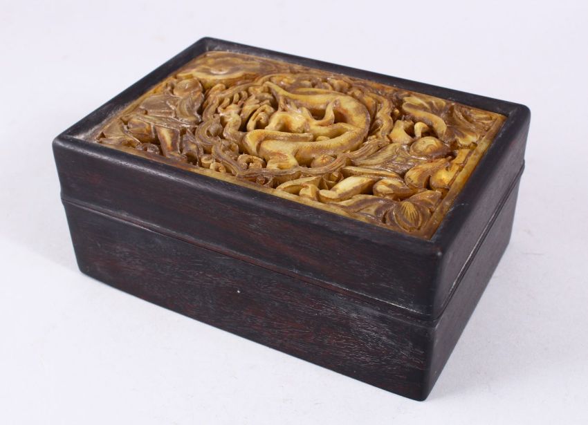 A GOOD CHINESE HARDWOOD & CARVED JADE LIDDED BOX, the jade insert carved with figures and dragons in archaic form, 18cm wide x 12cm deep x 8cm high.