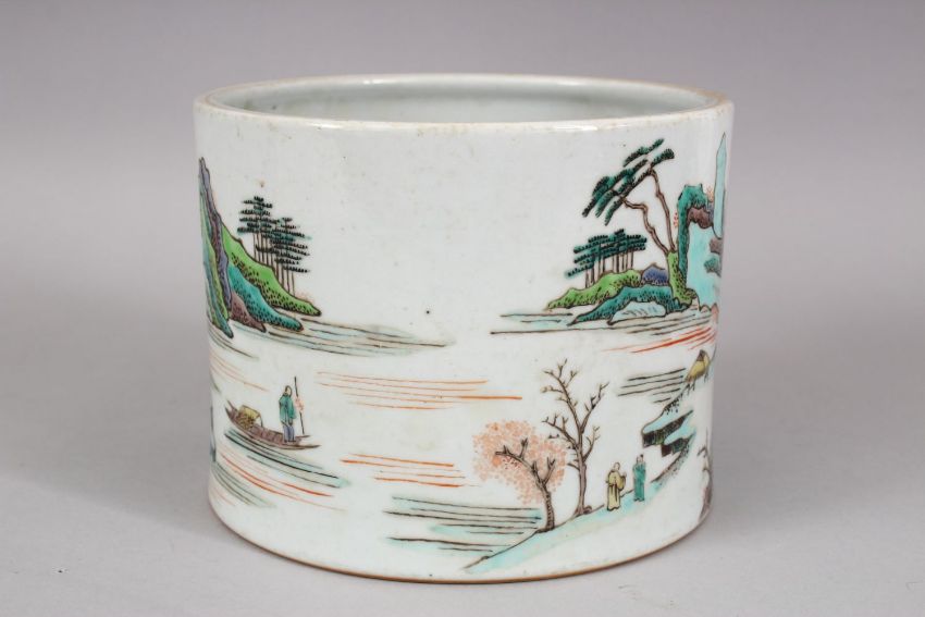 A GOOD LARGE CHINESE FAMILLE ROSE PORCELAIN BRUSH WASH, decorated with native landscape views, 17cm.