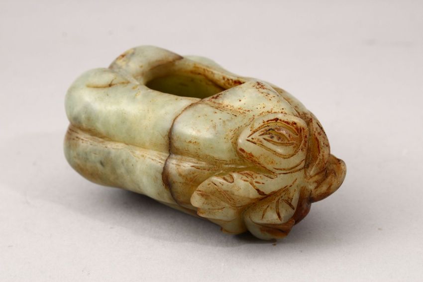 A GOOD 20TH CENTURY CHINESE CARVED JADE BRUSH WASH IN THE FORM OF A FRUIT, 9cm wide.