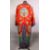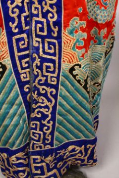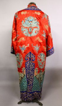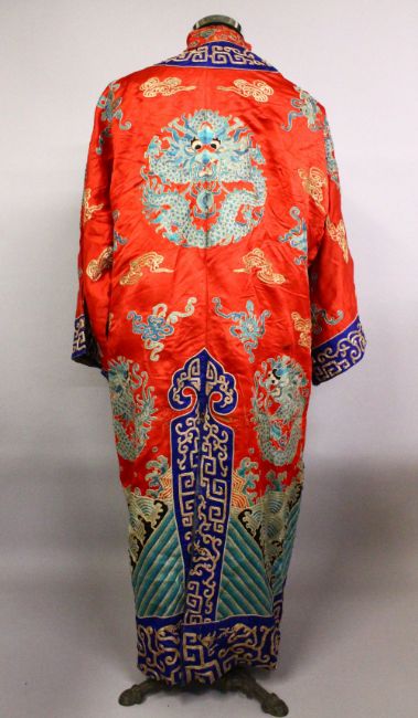 A FINE 19TH CENTURY CHINESE EMBROIDERED SILK DRAGON COURT ROBE, the silk of red ground with embroidered roundel's of dragons and Buddhist objects, with clouds, the lower section with wave form decoration, approx 120cm high x 150cm wide ( cuff to cuff) .