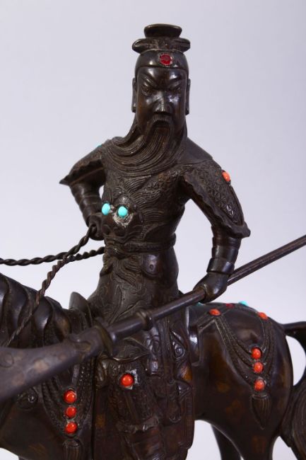 A GOOD 19TH / 20TH CENTURY CHINESE BRONZE FIGURE OF A GENERAL UPON HORSEBACK, decorated with inlaid turquoise and coral style stones, 16CM X 22CM.