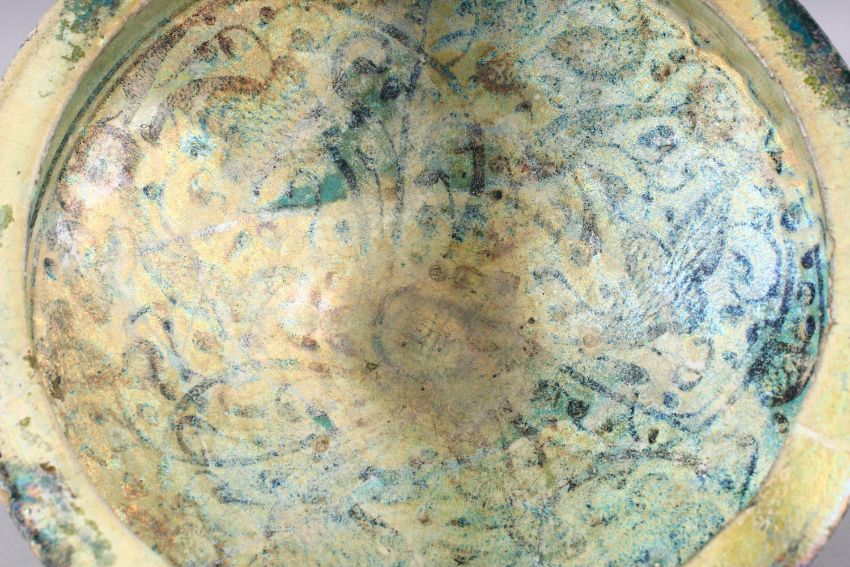 AN 12TH / 13TH CENTURY LARGE PERSIAN ISLAMIC TURQUOISE & BLACK CALLIGRAPHIC POTTERY BOWL, the bowl with outer band of black calligraphy upon a turquoise ground, the interior decorated with scrolling formal foliage motif, (af) 26.5cm diameter x 12cm high.