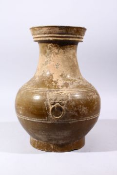 A GOOD CHINESE HAN DYNASTY TWIN HANDLE VASE, the vase with naturalistic remains, twin archaic handle and rings, 35cm.