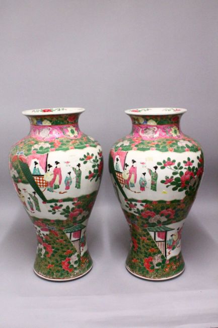 A LARGE PAIR OF JAPANESE FAMILLE ROSE STYLE PORCELAIN VASES, decorated with canton style decoration and figures in landscapes, 63cm.