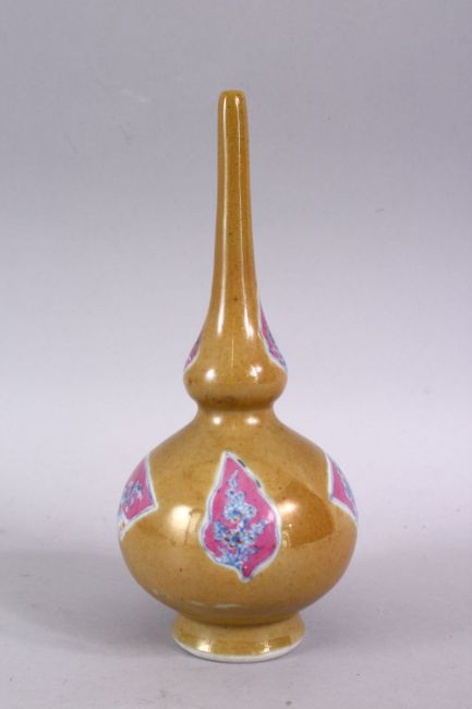 A 19TH CENTURY CHINESE BISCUIT GROUND PORCELAIN WATER SPRINKLER - FOR ISLAMIC MARKET, with pink fan panels of landscapes with underglaze blue decoration with gilt highlights. 20cm high.