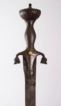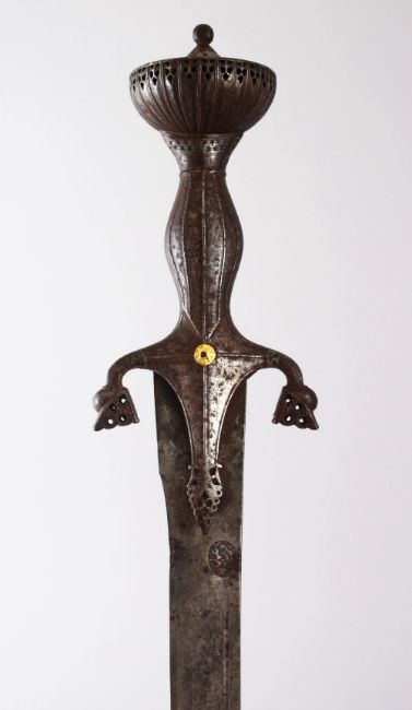 A FINE 18TH CENTURY AFGHAN STEEL PULWAR SWORD - BLADE SIGNED, with a gilt stud decoration and an open work hilt top, 92cm