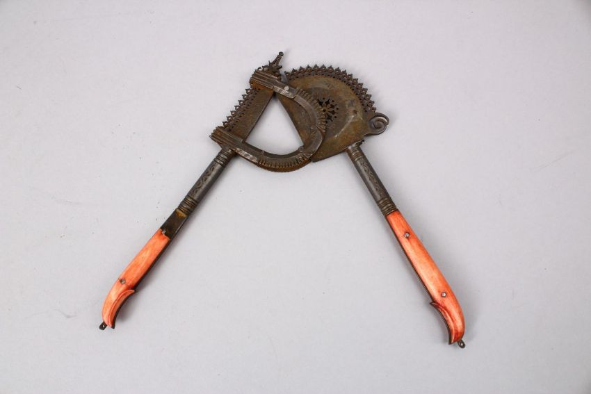 A 19TH CENTURY INDIAN STAINED IVORY HANDLE BEETLE NUT CRACKER, 17cm.
