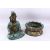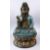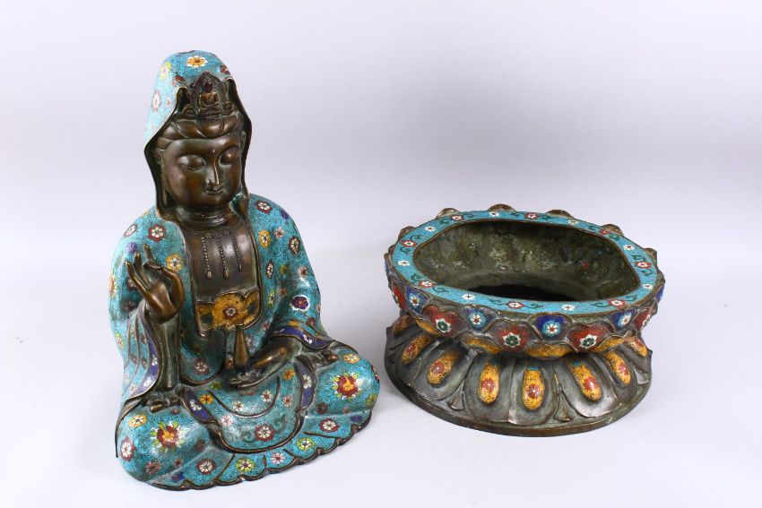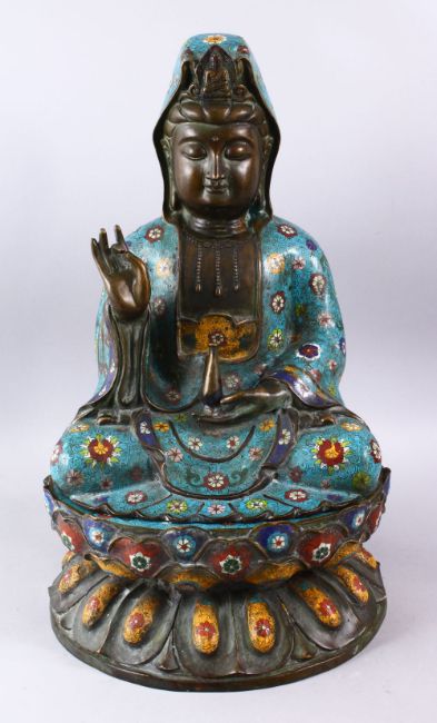 A FINE 19TH CENTURY CHINESE BRONZE & CLOISONNE MODEL OF GUANYIN SEATED UPON LOTUS, guanyin modeled holding a vase with one hand aloft, finely decorated with a turquoise ground with floral decoration, the separating lotus form base finely decorated with an array of colours and floral decoration, 60cm high x 16cm wide x 30cm deep.