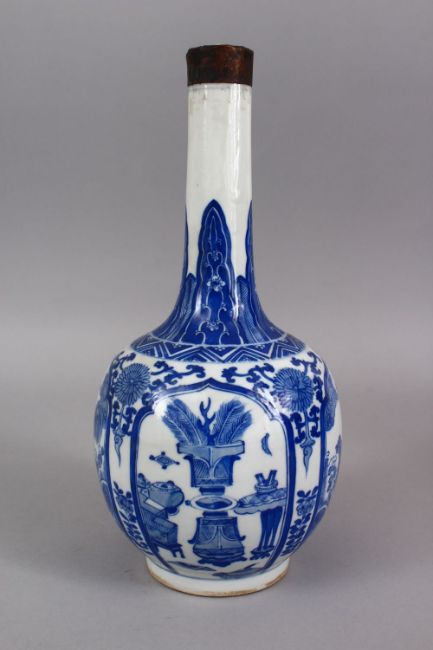 A GOOD CHINESE BLUE & WHITE PORCELAIN BOTTLE VASE, with panels of native flora and lion dogs, around formal native floral decor, with a metal mounted rim, 27.5cm high.