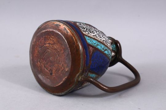 A 19TH CENTURY ISLAMIC BRASS & ENAMEL CALLIGRAPHIC EWER, with panels of enamel decoration with calligraphy, 13cm high.
