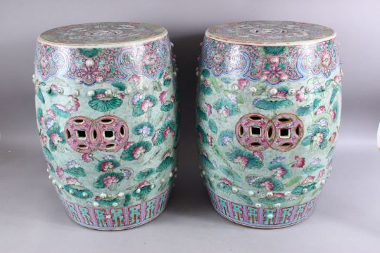 A GOOD PAIR OF CHINESE FAMILLE ROSE PORCELAIN GARDEN BARREL SEATS, each decorated with a celadon colour glaze as water, with displays of lotus and ducks waterside, with bands of hanging borders, with open work and stud sections, and greek key borders, 49cm high x 35cm