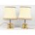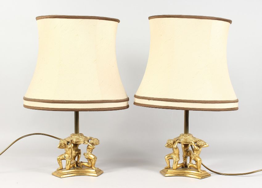 A GOOD PAIR OF ORMOLU TABLE LAMPS, the concave sided base with three kneeling figures.