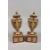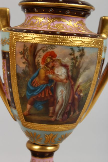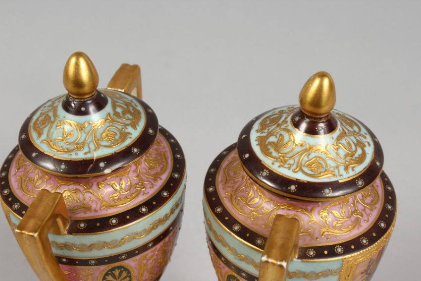 A GOOD PAIR OF 19TH CENTURY VIENNA TWO HANDLED URNS ON STANDS, with rich gilt decoration and classical scenes. Beehive mark.