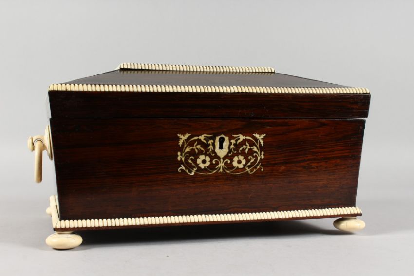 A SUPERB 19TH CENTURY ROSEWOOD AND IVORY BANDED SEWING BOX, with leather interior supported on ivory bun feet.