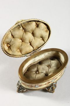 A SMALL PORCELAIN DECORATED OVAL JEWELLERY BOX.