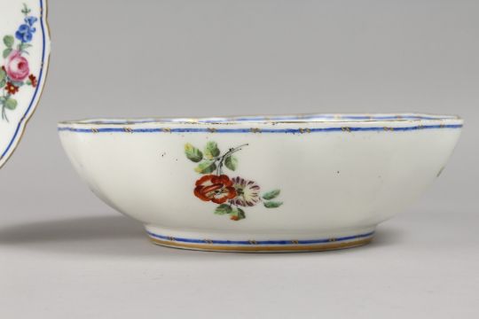 AN 18TH CENTURY SEVRES PLATE, painted flowers under a blue line border, interlaced L's in blue and a matching Sevres salad bowl, painted with scattered bouquets of flowers (2).