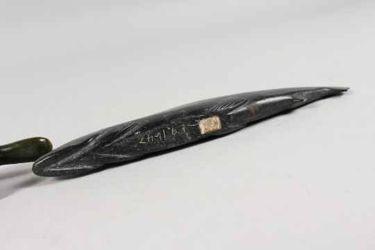 AN INUIT CARVED HARDSTONE FIGURE OF A FISH. "E9 1647" Artist: Aibilie Echalook. 8.5ins long.