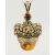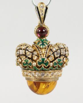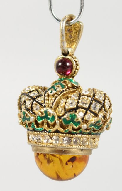 A SMALL RUSSIAN SILVER AND AMBER CROWN SHAPE PENDANT.