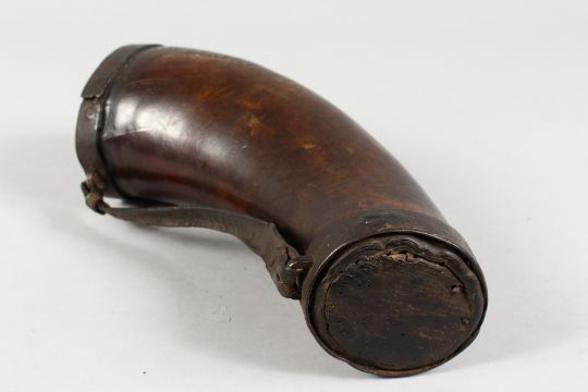 A LARGE EARLY 18TH CENTURY HORN DRINKING VESSEL with leather strap, dated 1710, with script.