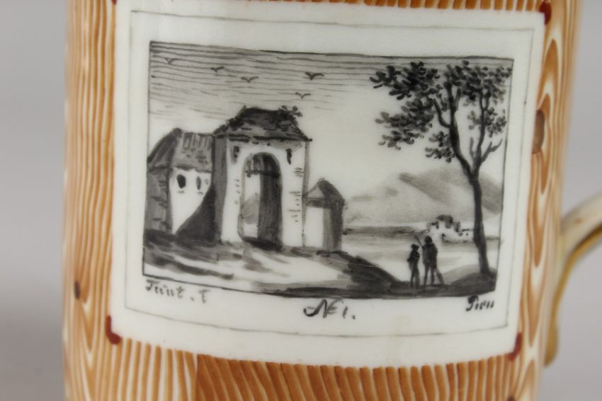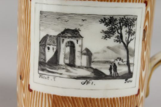 A VIENNA JUG decorated with sepia panels of rural scenes.
