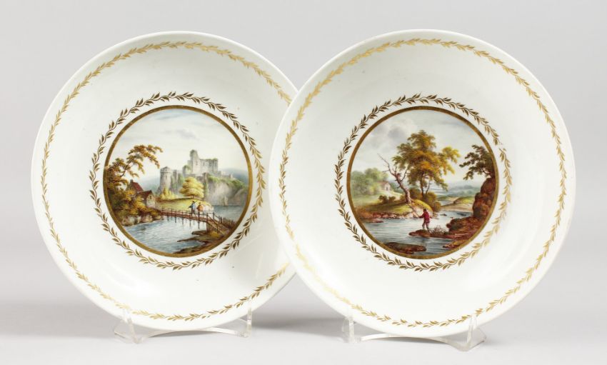 A PAIR OF 18TH CENTURY DERBY PLATES, painted with scenes entitled 'River Trent' and 'Italy', paper label for the Lucas Collection.
