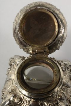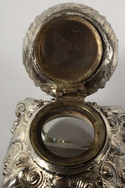 A GLASS INKWELL WITH HINGED SILVER TOP.