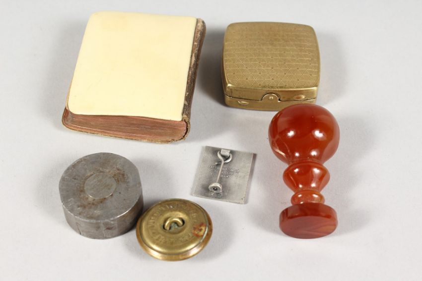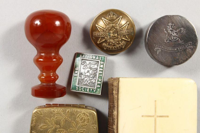 A MIXED LOT OF ITEMS, to include a prayer book. agate seal, etc.
