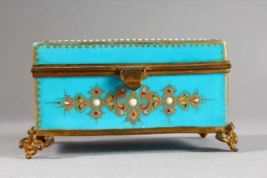 A 19TH CENTURY SEVRES BLEU CELESTE GROUND JEWELLERY CASKET, with gilt metal hinge and mounts, the cover painted with a panel of young lovers in a woodland glade, further enamel decoration to the top and sides.