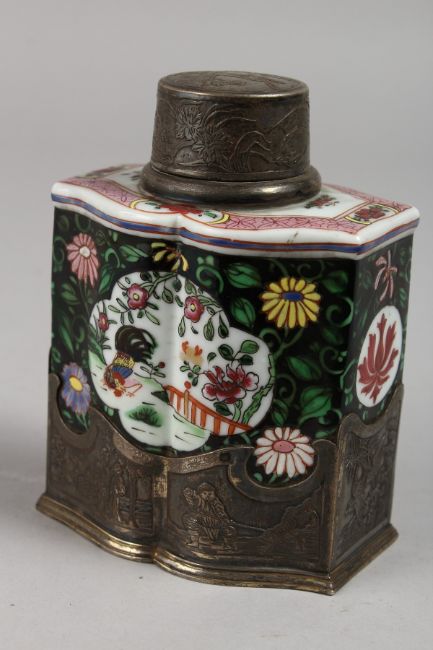A VERY GOOD SAMSON OF PARIS PORCELAIN CADDY, with Chinese decoration, silver cap and base.