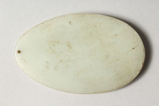 A CHINESE OVAL CARVED CELADON JADE PENDANT.