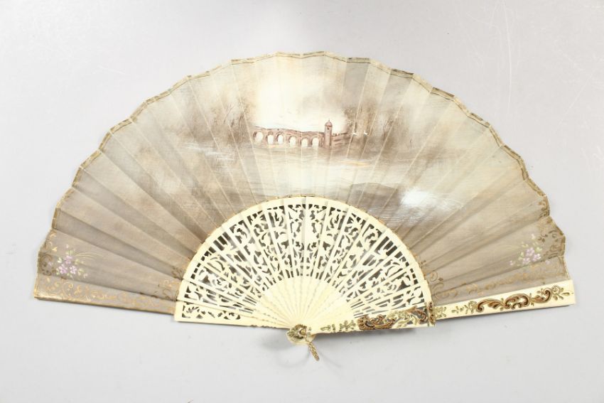 A GOOD IVORY AND PAPER FAN, painted by A. BASTITE, classical scene, in a box.