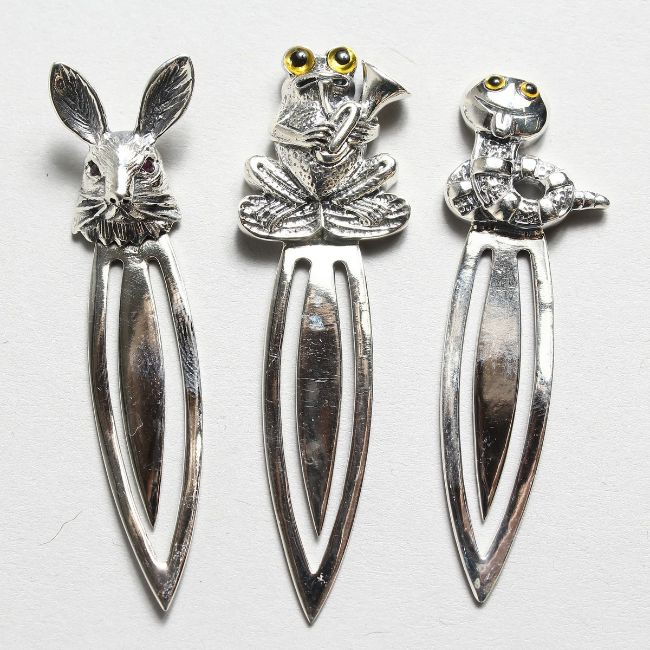 THREE NOVELTY SILVER BOOK MARKERS.