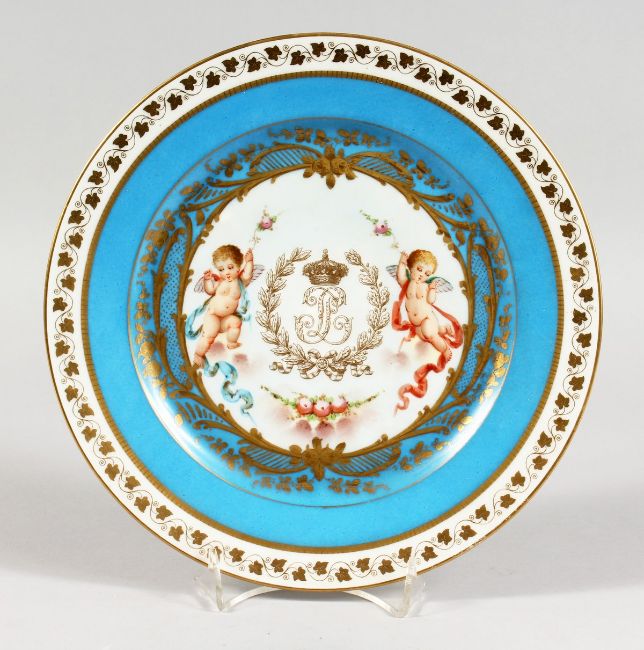 A GOOD SEVRES CABINET PLATE, the centre with a gilt monogram, with a cherub to each side within a powder blue and gilt decorated border.