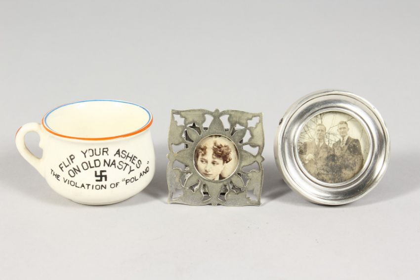 FOUR SMALL PHOTOGRAPH FRAMES AND A NOVELTY HITLER CUP