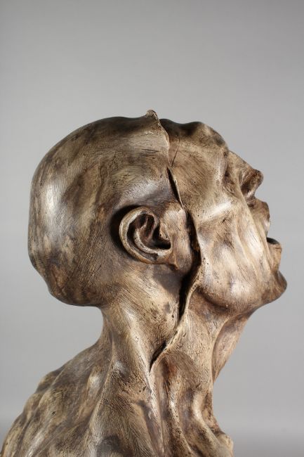 A FIBREGLASS SCULPTURE "REVELATION" (JOURNEY) by DEAN BARRETT on a wooden column base.
