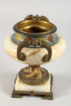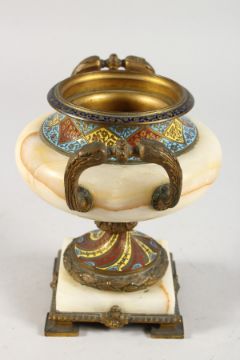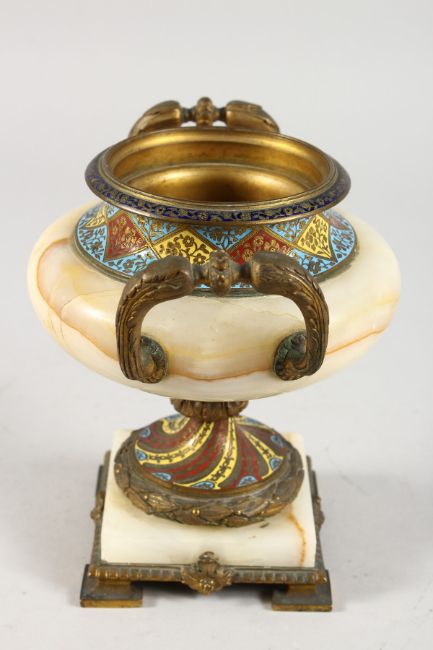 A BRONZE, ONYX AND CHAMPLEVE ENAMEL TWIN-HANDLED PEDESTAL URN.