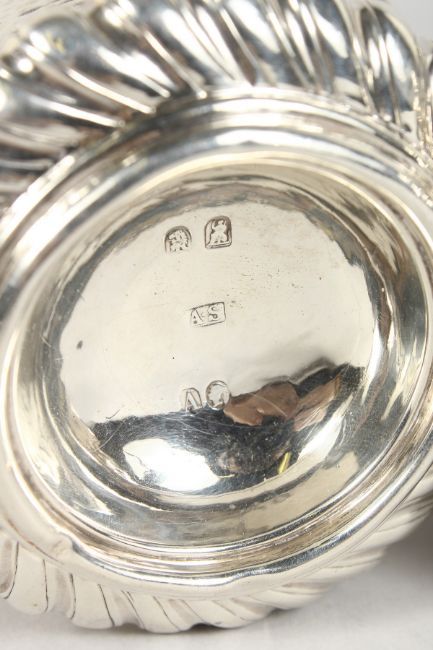 A PAIR OF VICTORIAN BRITANNIA STANDARD SILVER SALT CELLARS of Queen Anne design with gadrooned edge, 3.25ins diameter.