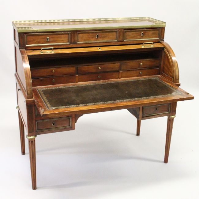 A GOOD 19TH CENTURY FRENCH EMPIRE MAHOGANY INLAID CYLINDER DESK, with galleried top, three small drawers, the cylinder opening to reveal three further drawers and a leather inset pull-out writing surface above an arrangement of five drawers, supported on fluted tapering legs.