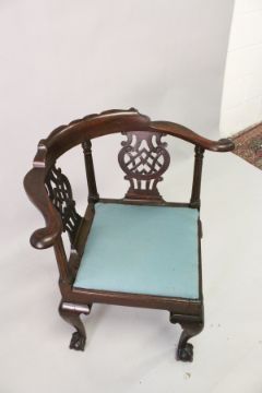 A VERY GOOD 18TH CENTURY MAHOGANY CORNER ARMCHAIR, possibly American/ Philadelphia, with a shaped cresting rail, curving out-swept arms, pair of pierced splats and three turned and fluted columns, with a drop-in seat, on cabriole legs with claw and ball feet.