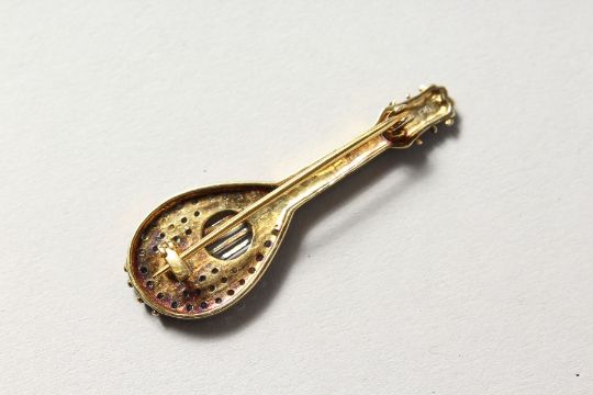 A 9CT GOLD AND SILVER, OPAL AND DIAMOND SET MANDOLIN BROOCH.