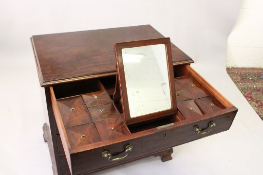 A GOOD GEORGE III MAHOGANY DRESSING CHEST, with four long graduated drawers, the top drawer fitting with a baize lined writing surface, adjustable mirror and numerous lidded compartments, raised on ogee bracket feet.