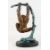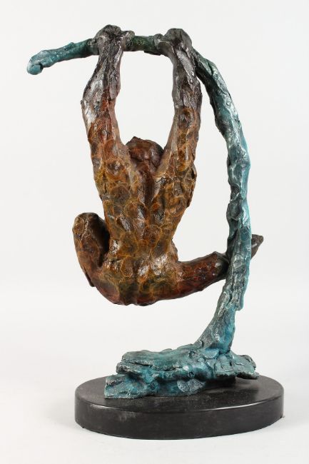 AN UNUSUAL PAINTED BRONZE FIGURE OF AN ORANGUTAN SWINGING ON A BRANCH, on a marble base.