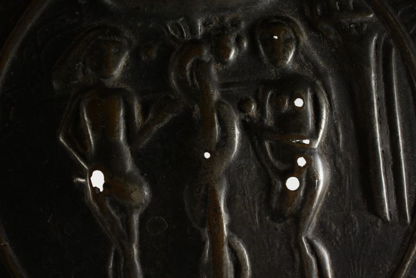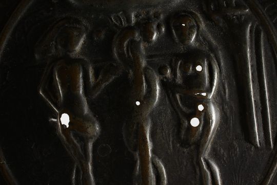 A 16TH CENTURY GERMAN BRASS ALMS DISH, with embossed decoration depicting Adam and Eve beside the Tree of Life entwined with a serpent.
