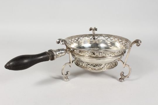 A RARE QUEEN ANNE CIRCULAR SILVER BRAZIER, pierced edge, scrolled feet and turned wood handle.