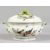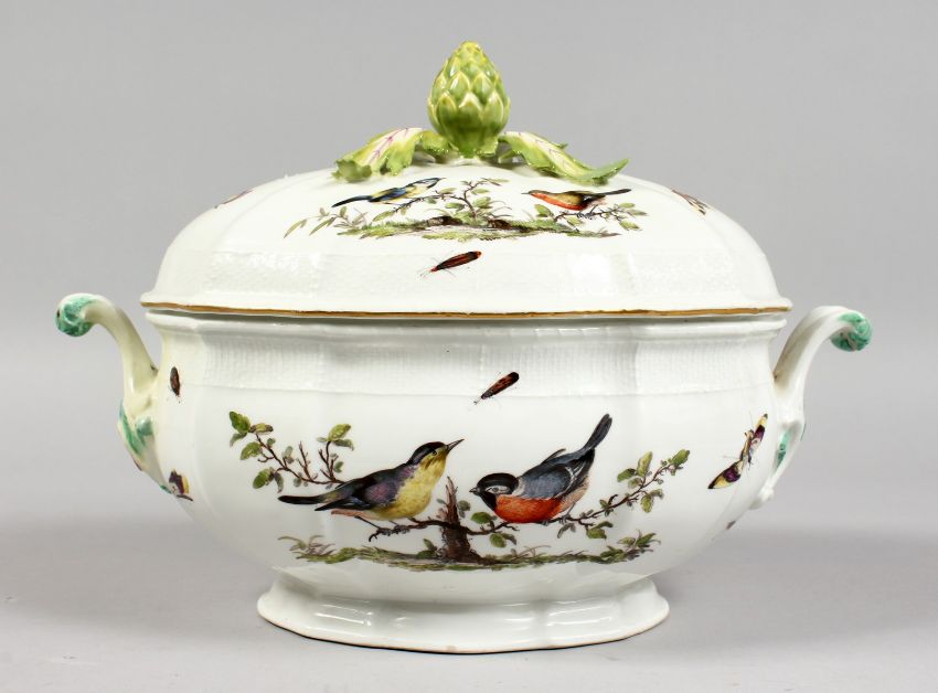 A SUPERB 18TH CENTURY MEISSEN PORCELAIN OVAL TWO HANDLED TUREEN AND COVER, with pineapple finial and painted with birds and moths. Crossed swords mark in blue.