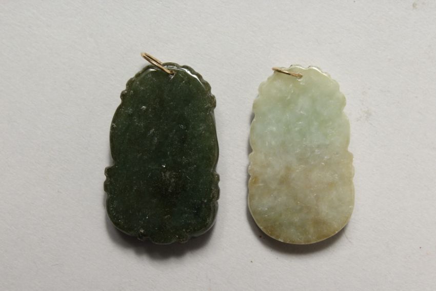 TWO CHINESE CARVED JADE PENDANTS WITH GOLD MOUNTS.